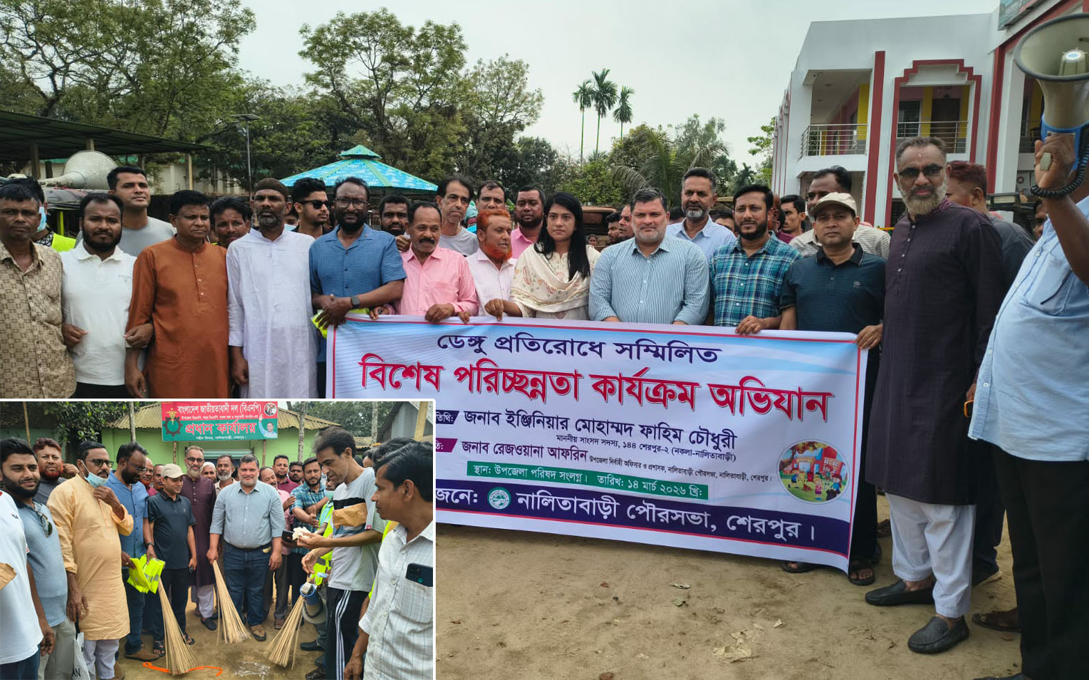 শেরপুরের নালিতাবাড়ীতে ডেঙ্গু প্রতিরোধে পরিচ্ছন্নতা অভিযান পরিচালনা করা হয়েছে। অভিযানের অংশ হিসেবে উপজেলা স্বাস্থ্য কমপ্লেক্স চত্বরসহ শহরের উত্তর বাজার এলাকার বিভিন্ন স্থানে পরিষ্কার–পরিচ্ছন্নতা কার্যক্রম চালানো হয়। ১৪ মার্চ শনিবার দুপুরে ওই কর্মসূচির উদ্বোধন করেন শেরপুর-২ আসনের সংসদ সদস্য মোহাম্মদ ফাহিম চৌধুরী।