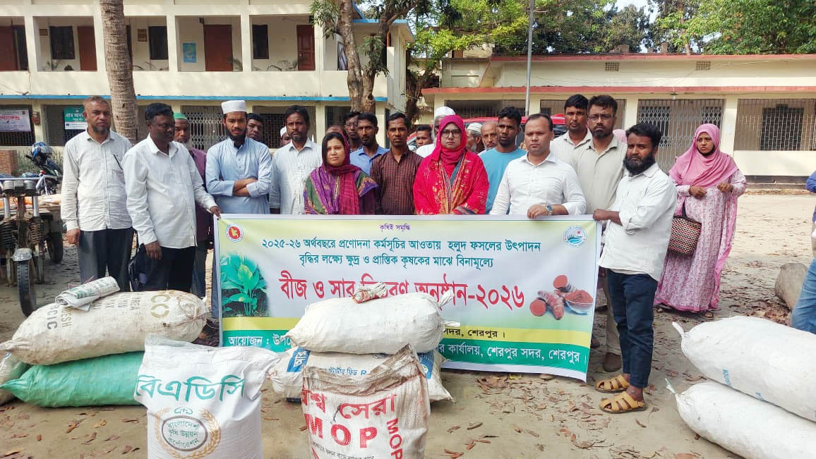 শেরপুর সদর উপজেলায় ২০২৫-২৬ অর্থবছরের কৃষি প্রণোদনা কর্মসূচির আওতায় হলুদ ফসল উৎপাদন বৃদ্ধির লক্ষ্যে ক্ষুদ্র ও প্রান্তিক কৃষকদের মধ্যে বিনামূল্যে হলুদ বীজ ও সার বিতরণ করা হয়েছে। ১৫ মার্চ রবিবার দুপুরে সদর উপজেলা কৃষি সম্প্রসারণ অধিদপ্তরের আয়োজনে উপজেলা পরিষদ প্রাঙ্গণে প্রধান অতিথি হিসেবে উপস্থিত থেকে ওই বিতরণ কার্যক্রমের উদ্বোধন করেন উপজেলা নির্বাহী কর্মকর্তা মাহবুবা হক।