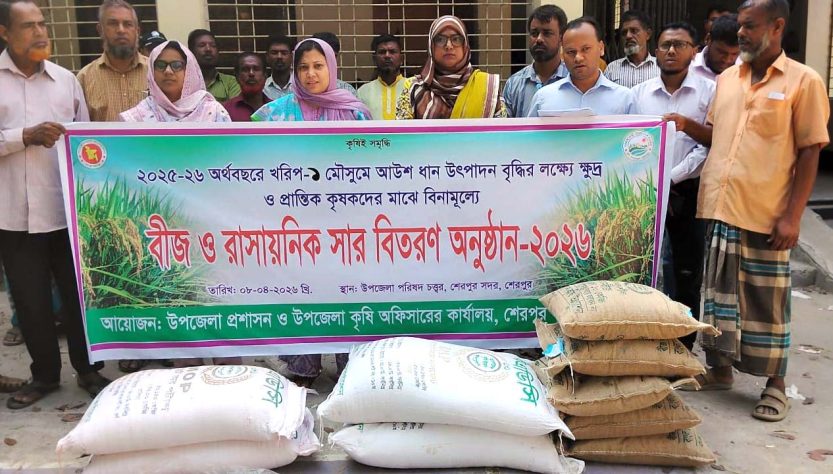 শেরপুরে ২০২৫-২৬ অর্থ বছরে খরিপ-১ মৌমুসে আউশ ধান উৎপাদন বৃদ্ধির লক্ষ্যে ক্ষুদ্র ও প্রান্তিক কৃষকদের মাঝে বিনামূল্যে বীজ ও রাসায়নিক সার বিতরণ করা হয়েছে।৮ এপ্রিল বুধবার বিকেলে সদর উপজেলা পরিষদ প্রাঙ্গনে উপজেলা প্রশাসন ও উপজেলা কৃষি অফিসের উদ্যোগে সদর উপজেলার কৃষকদের মাঝে ওই বীজ ও সার তুলে দেওয়া হয়।