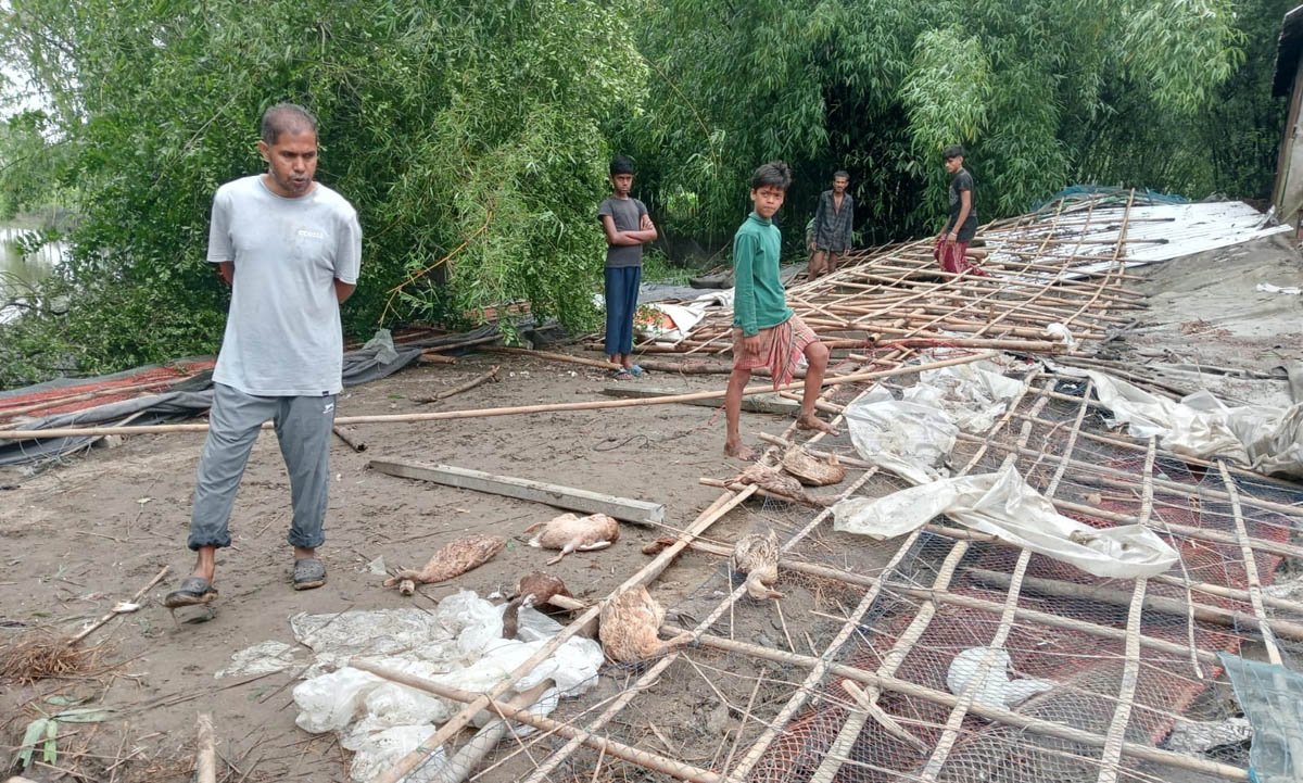 বুধবার দুপুরে সরজমিনে গিয়ে দেখা যায়, ঝড়ে হাঁসের খামারের ঘরটি সম্পূর্ণরূপে বিধ্বস্ত হয়েছে। মৃত হাঁস ও ডিম গুলো ছড়িয়ে ছিটিয়ে রয়েছে। শ্রমিকরা ঘর মেরামতের জন্য কাজ করছে।